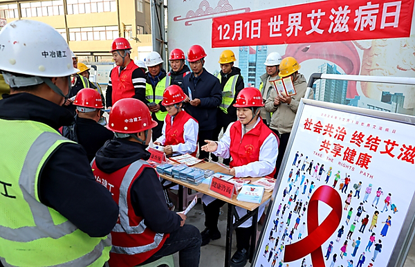 12月1日,在山东省枣庄市光明路街道一处建筑工地,医务志愿者向建筑工人宣讲艾滋病防治知识。