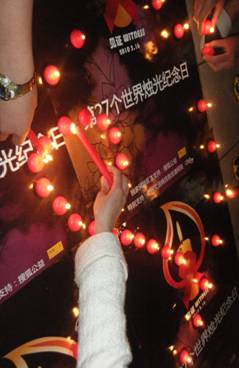 开展感染者互助工作的青岛爱心行工作组在5月16日举办了志愿者培训,当地市、区疾控、传染病院部分医生和10多名感染者一起参加了交流培训。当夜幕降临,大家一起点燃红蜡烛,红蜡烛外面摆成一个29根蜡烛组成的心形图案??这也是工作组的标识,里面是一个红丝带图案,总计54根蜡烛。29根蜡烛代表今年是人类与艾滋病斗争的第29年,而工作组共计54人则用蜡烛的总数表示。在温暖的烛光和2010年烛光纪念日主题曲《日子》的音乐声中,大家一起表达对逝者的追思和对未来生活的信心和祝福,烛光点点、泪光闪闪。