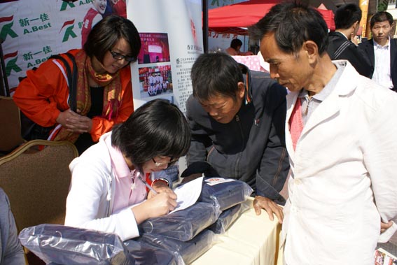 嘉宾共同为农民工代表发放健康包