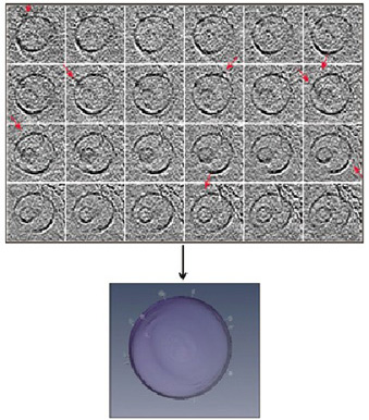 用冷冻电镜层像技术显示的HIV 病毒样颗粒。图中红色箭头显示刺突蛋白。