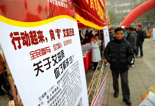 12月1日,西安市钟鼓楼广场举行“世界艾滋病日”宣传活动。当日是世界艾滋病日,陕西省卫生部门和志愿者协会在西安市钟鼓楼广场开展以“行动起来,向‘零’艾滋迈进”为主题的防治艾滋病宣传活动,向广大市民普及艾滋病防治知识。新华社记者 李一博 摄
