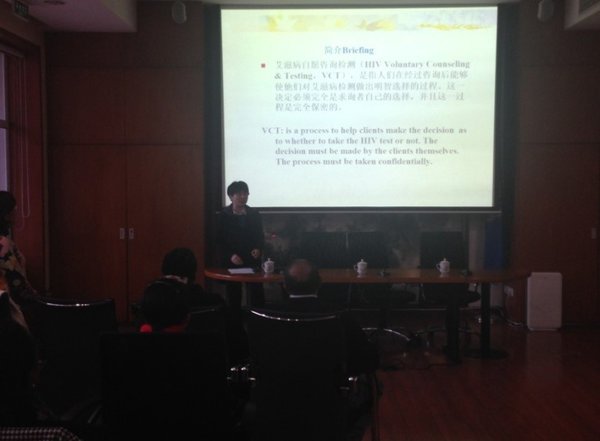 疾控中心工作人员首先为参与人员讲解了艾滋病的相关知识,重点介绍了自愿咨询检测门诊(VCT)及门诊的工作流程,包括检测前咨询与检测后咨询的要点,重申了咨询与检测过程中须严格遵守的自愿与保密等原则。参与人员纷纷表示,通过讲解对VCT门诊有了进一步深入的了解,并在讲解结束后对讲解过程中感兴趣的问题进行了提问,大家围绕问题进行了深入的探讨。讲解结束后,本着自愿与保密的原则,疾控中心工作人员为10余人进行了HIV抗体快速检测,并及时反馈了检测结果。