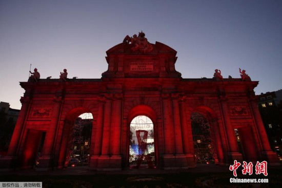 西班牙马德里的阿尔卡拉门在世界艾滋病日当天用红色点亮。