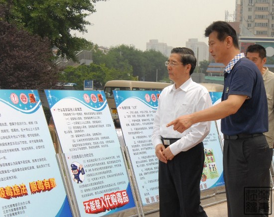 图为郭声琨仔细观看活动现场摆放的禁毒宣传展板