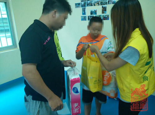 图为社工为康复学员家庭赠送慰问品