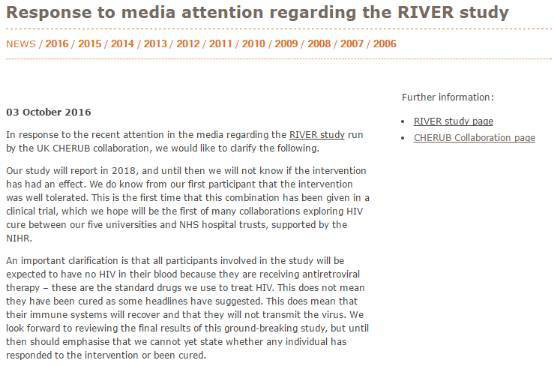 面对众多媒体“艾滋病患者疑似被治愈” 的报道,RIVERS项目研究人员在网站上发表了官方声明: