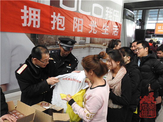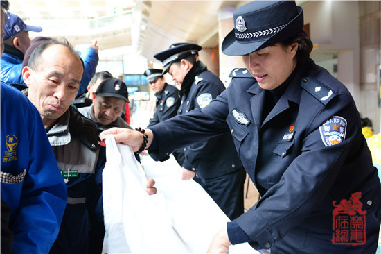 图为北京南站负责人向群众分发禁毒宣传衫