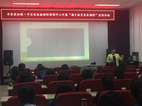 为进一步响应第29届世界艾滋病日主题号召,丰台区防治艾滋病工作委员会联合区妇联举办了“携手抗艾,重在预防”系列宣传活动,在辖区广泛开展预防艾滋病宣传教育活动,普及防艾知识。4月24日上午,在王佐镇怪村村民学校开启了防艾宣传的第一站。本次活动采取知识讲座的形式,向村民姐妹们讲授了艾滋病基本知识、推广安全套使用、母婴阻断知识、免费检测点信息等,消除大家对艾滋病的未知感和恐惧感,提高防艾抗艾自我保护意识和能力,并号召受众向家人和同伴姐妹主动宣传,进一步扩大宣传教育覆盖面。讲座后,工作人员现场发放艾滋病知识宣传册、小礼品约100余份,并接受现场咨询,群众反映热烈。