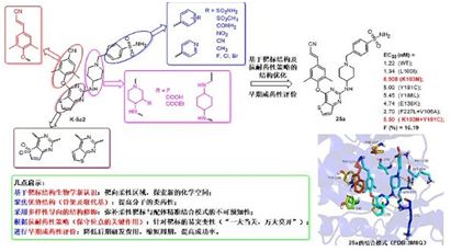 化合物 25a(DK5-1)具有抑制 HIV- 1 野生株和多种临床常见突变株的活性,较先导化合物 K -5a2 和依曲韦林均有大幅度提高。其中,抑制临床最常见的突变株 K103N 的活性(EC50= 0.908 nM)是 K -5a2 的 3 倍;尤其是抑制临床严重的双突变株 RES056(EC50 = 5.50 nM)的活性是 K -5a2 的 6 倍、依曲韦林的 3 倍。对单突变株 L100I、Y181C、Y188L 和 E138K,25a 的 EC50 值均小于 5.5 nM,远优于上市药物依曲韦林。初步的药代动力学试验显示 25a 在大鼠体内达峰时间为 1.7 小时,半衰期为 3.93 小时,并显示出良好的口服生物利用度(F = 16.19 %)。小鼠急性毒性试验表明,其 LD50> 2000 mg/kg,心脏毒性试验结果显示其抑制 hERG 钾离子通道的作用较低。目前正在对 25a 进行后续的成药性和临床前评价。