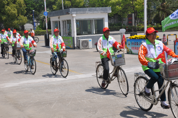 图为老年禁毒志愿者骑车宣传禁毒