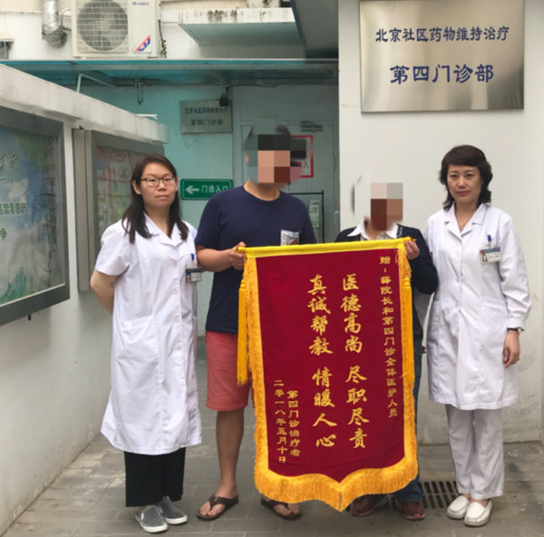 2018年5月16日上午,社区药物维持第四门诊治疗者王某和吴某将一面鲜红的锦旗和一封真挚的感谢信送至门诊主管领导薛芬副院长(主持行政工作)手中,衷心地感谢薛院长和门诊工作人员,是他们精心的帮教和温暖的关爱,让自己重新鼓起勇气,坚定了戒毒信心,重新回归了社会,拥有了现在的美好生活。