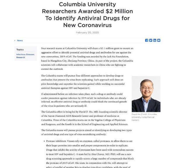 据哥伦比亚大学官网消息,近日,马云公益基金会、哥伦比亚大学签署合作协议,共同围绕新型冠状病毒药物及抗体研发展开攻关,何大一任该项目的总负责人。相关项目的目标设定、研究执行、结果跟踪等均在其指导下进行。马云公益基金会将为相应研究工作提供总额约1500万元人民币的资金支持。
