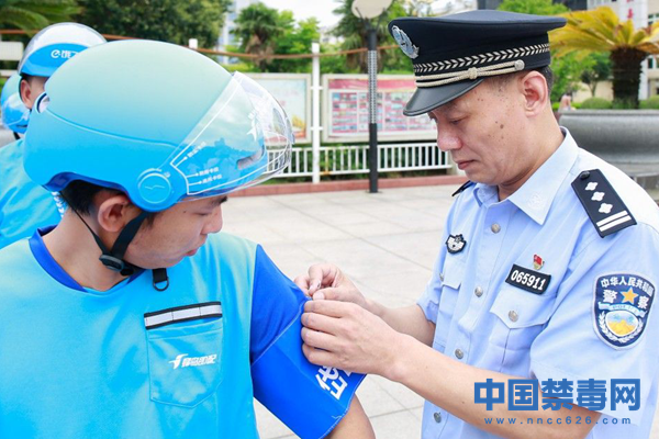 6月23日,浙江省舟山市岱山县公安局,禁毒大队民警为外卖骑手佩戴上禁毒宣传员袖标。邹训永 摄