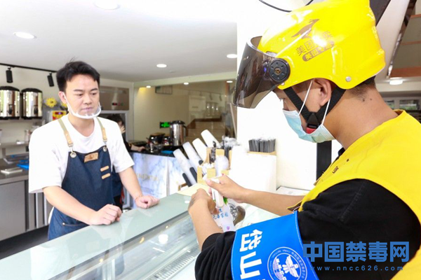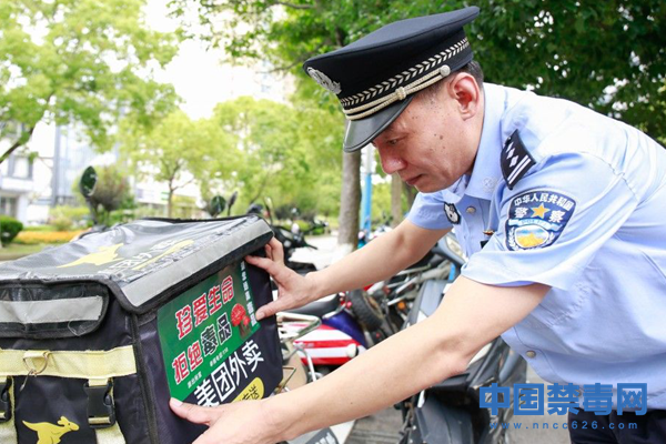 6月23日,江省舟山市岱山县,禁毒大队民警在外卖骑手的箱包上贴禁毒宣传单。邹训永 摄