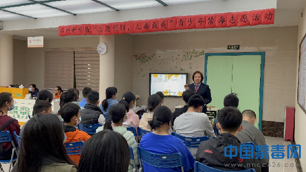 图为禁毒讲师向青少年志愿者讲解禁毒知识。中国禁毒网发