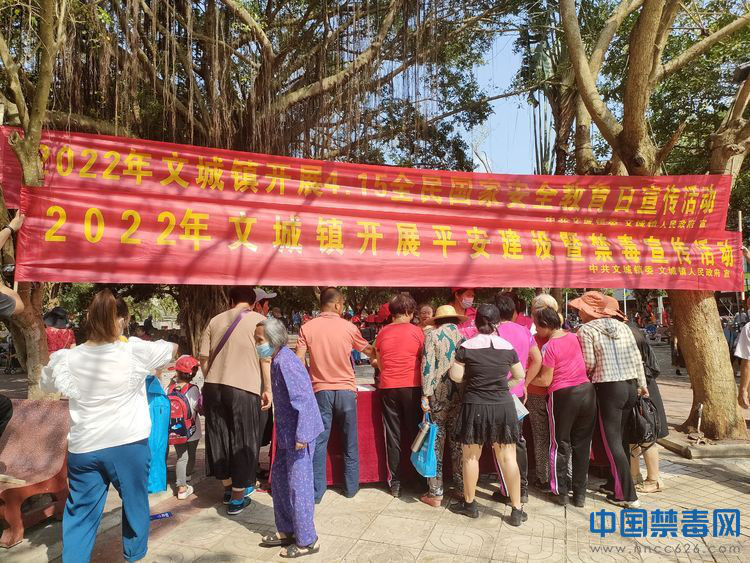 中国禁毒网讯 为进一步提高群众抵制毒品的能力,提升全民国家安全意识,4月15日上午,海南省文昌市文城镇以“4·15”国家安全日为契机,镇政法办牵头,联合镇妇联、镇团委开展2022年“4·15”全民国家安全教育日暨禁毒宣传活动。