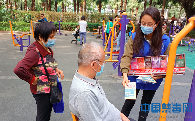 图为社工向群众发放禁毒宣传单张。中国禁毒网发