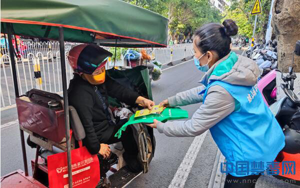 图为工作人员向群众发放宣传折页。中国禁毒网发