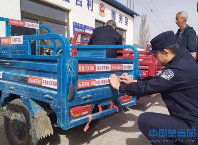 图为民警在电动车粘贴禁毒宣传标语。中国禁毒网发