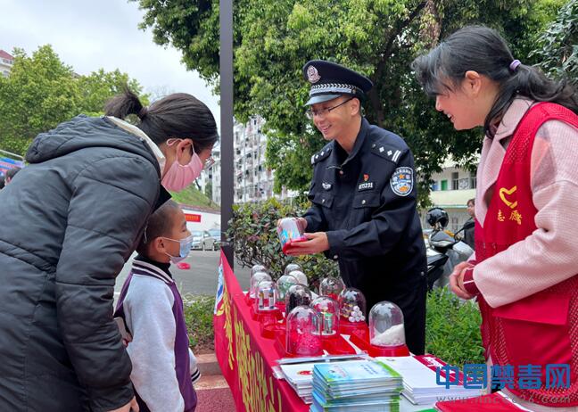 图为禁毒专干向群众展示毒品仿真模型。中国禁毒网发