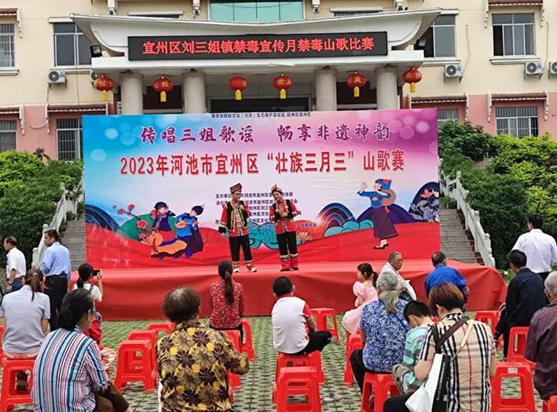 在刘三姐镇、三岔镇、石别镇、洛西镇、同德乡、屏南乡、福龙瑶族乡等地,禁毒山歌赛、文体竞赛、美食品鉴、文艺汇演等活动吸引了众多群众热情参与。舞台上,禁毒山歌唱出了人们抵制毒品,支持禁毒的心声。
