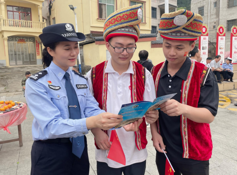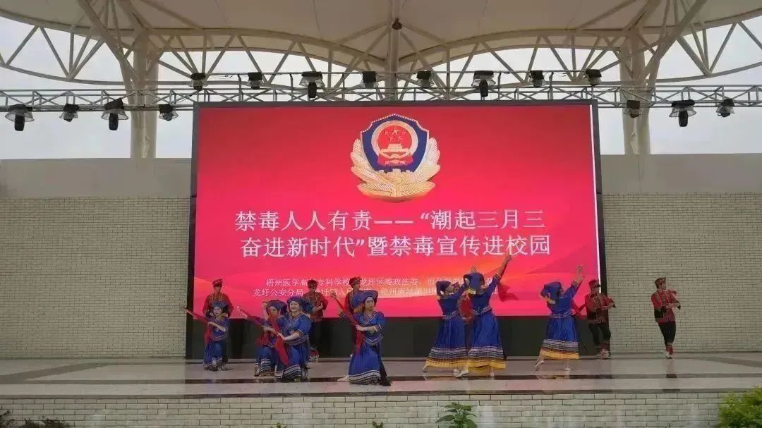 4月18日下午,结合“壮族三月三”传统文化节日,梧州市公安局龙圩区分局联合市公安局禁毒支队、龙圩区政法委等部门到梧州医学高等专科学校开展2023年“潮起三月三奋进新时代”暨禁毒宣传进校园活动,充分发扬壮族歌舞文化精神,将传统演艺形式与禁毒、网络诈骗、反邪教、民族团结等提升群众安全感满意度宣传工作有机融合。