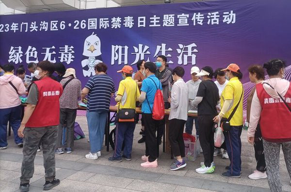 2023年6月26日是第36个国际禁毒日,为了深入贯彻落实习近平总书记关于禁毒工作的指示精神,普及禁毒宣传教育,提高民众拒毒、防毒意识,6月26日,门头沟区禁毒委员会在门头沟区体育馆前举办了以“绿色无毒 阳光生活”为主题的2023年门头沟区6.26国际禁毒日宣传活动。门头沟区疾控中心积极参与,组织宣传小分队参加了宣传,现场发放“禁毒防艾”宣传材料3种450余份,摆放展板3块,悬挂横幅1条,宣传品96份,安全套200只。