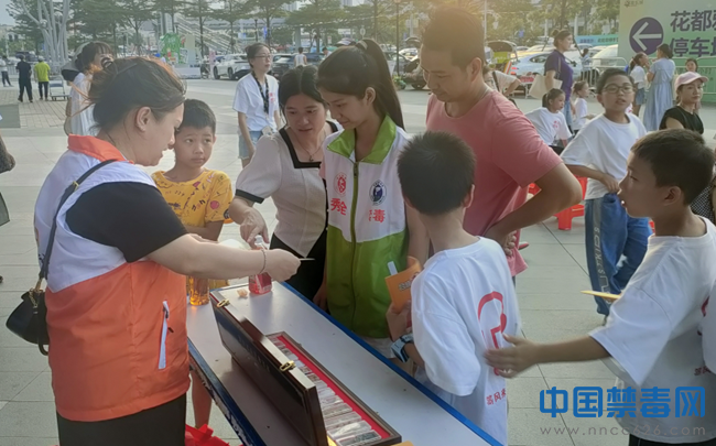图为禁毒志愿者向群众展示毒品仿真模型。中国禁毒网发