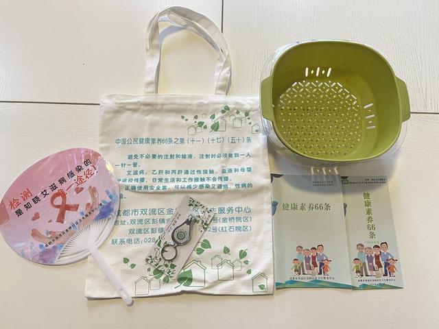 40分钟有趣、有用、有料的健康讲座结束后,在发放“健康文创”礼包时,又迎来了一波“小高潮”。一个印有健康素养知识的文化布袋、一把“防艾”科普扇、一个印有金桥社区卫生服务中心logo的绿色菜盆、一把指甲剪以及一份今年5月由国家卫生健康委发布的新版“健康素养66条”宣传折页,实用的健康“五件套”受到居民青睐。“我前段时间去彭镇昆山社区耍的时候,看到不少居民都背着这个文化布袋,多方便的,上面还印有健康提示,背出去买东西既能时常提醒自己还能提醒他人,很巴适!这个健康素养画册就给女儿看,她上班参加不到讲座,晚上可以学习一下上面的健康知识。”领到“健康文创”礼包的张阿姨对每一件单品都赞不绝口,并开心地表示今天的健康讲座“收获很大”!