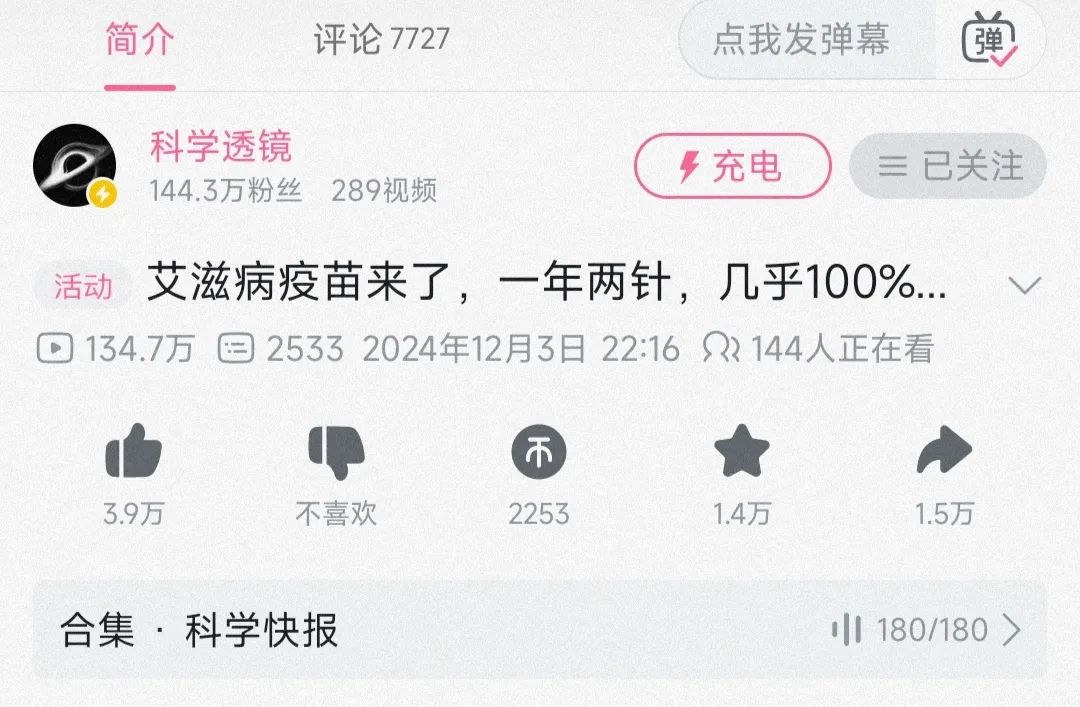 12月3日,b站up主“科学透镜”发布了一条标题为《艾滋病疫苗来了,一年两针,几乎100%阻断HIV感染》的视频[1],其中介绍了美国的一家医药企业吉列德科学(Gilead sciences)进行的艾滋暴露前预防(PREP)药品Lenacapavir临床实验的研究报告,声称阻断效果达到100%。视频一经发出便迅速冲上b站热门,引起网友热议。截至12月5日15:00,这条视频已经拥有134.7万的播放量和7727条评论。