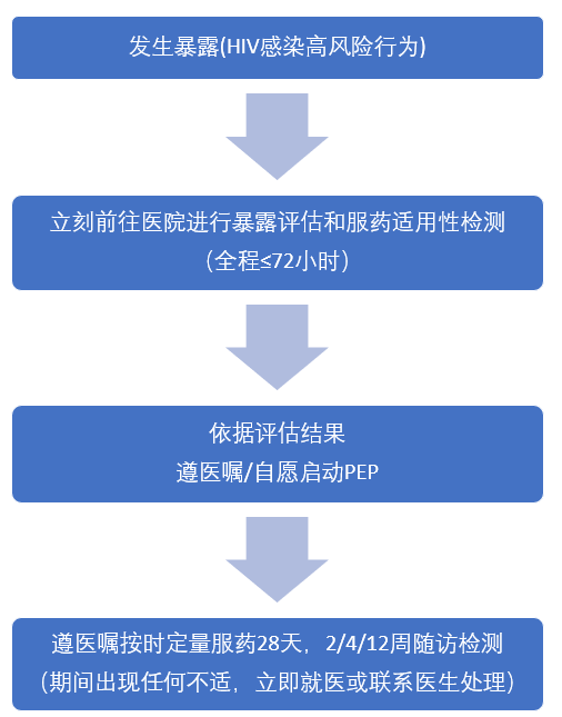 注意:超过72小时不推荐服药,谨遵医嘱进行后续HIV抗体或核酸检测,若发现HIV感染,第一时间启动抗病毒治疗。若属职业暴露还需遵循相关处置规定和流程。