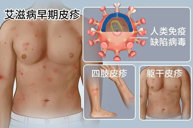 免疫机制在抵御病毒入侵过程中,会出现系列反应,其中就包括皮肤红疹现象,呈现红色或褐色凸起皮疹,触摸有痛感。一般急性感染期患者红疹会在一段时间后消失,但进入艾滋病期后,就会持续出现,甚至蔓延到身体躯干和四肢。