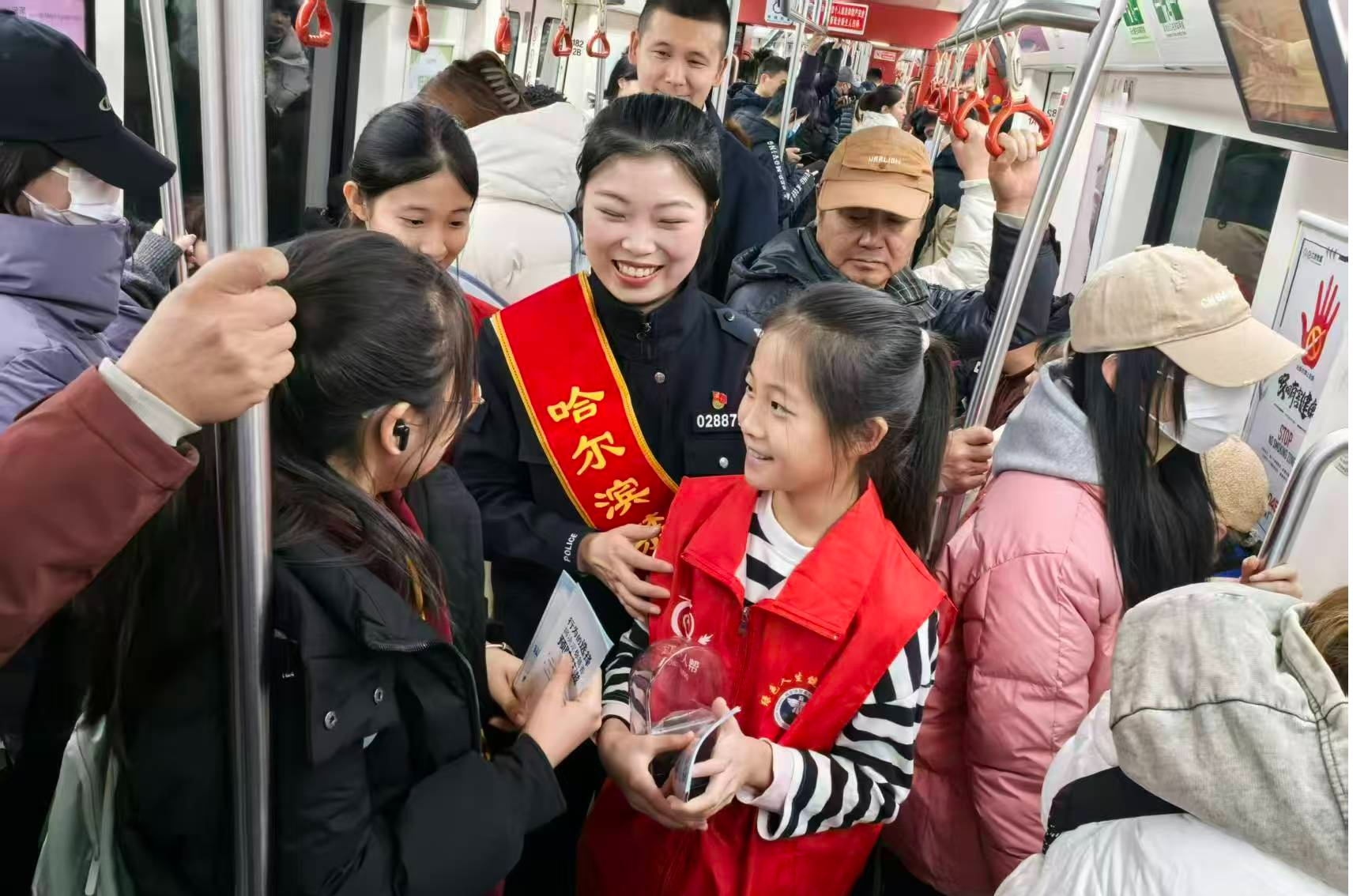 在地铁站厅,一场形式新颖的禁毒防艾“快闪”宣传正上演。公交分局、南岗分局禁毒大队的民警与志愿者们通过朗朗上口的顺口溜、分发宣传折页等方式,向过往乘客传递健康理念。志愿者们主动走近候车人群,开展简短的知识互动与问答,在轻松氛围中帮助大家牢记关键信息,不少乘客驻足倾听、频频点头。