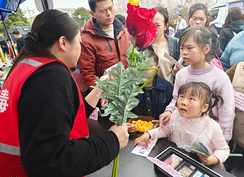 在广陈镇的宣传摊位前,社工举起仿真罂粟模型,手把手教群众区分“毒花”与虞美人。